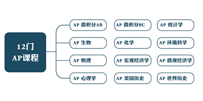 学校提供的AP课程让学生有机会在高中预修大学课程,在满足一定成绩后,获得大学学分。主要开设以下12门AP课程: